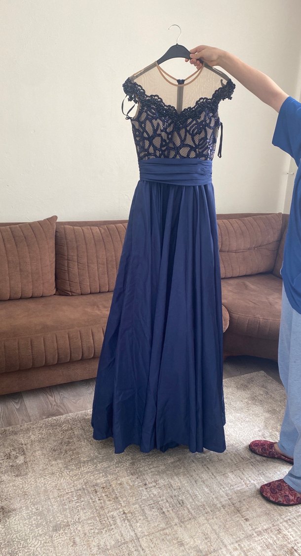 Lacivert uzun abiye elbise, drapeli beli ve vücuda oturan kesimi ile. Dantel detaylı straplez üst kısmı ve kolsuz tasarımıyla düğün ve özel günler için uygun. Kurdelasının çıt çıtı takılacak tek kusuru bu