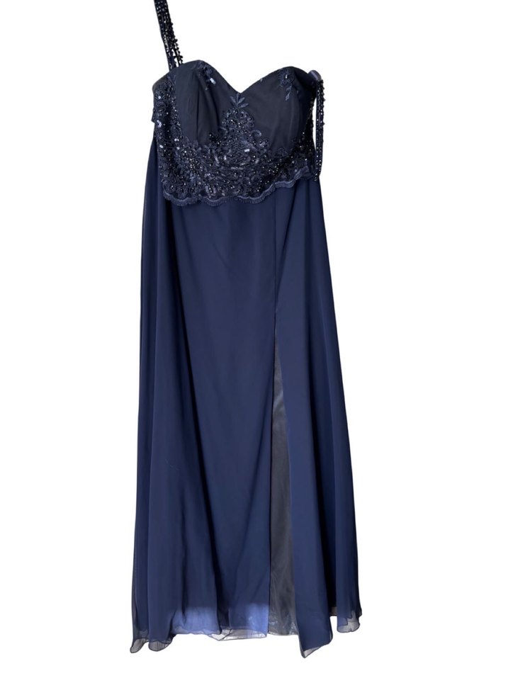Lacivert uzun abiye , straplez ve drapeli tasarımıyla dikkat çeker. Kolsuz ve vücuda oturan kesimi, düğünler için uygundur. Etek ve üst olarak ayrı ancak giyince elbise gibi gözüküyor Askıları omuza düşürülerek kullanılıyor görünmesi için o şekilde çektim 1 kere giyildi boncukları el işlemesi ve kaliteli birürün göğüs kulpları var Göğüs 80 bel 72