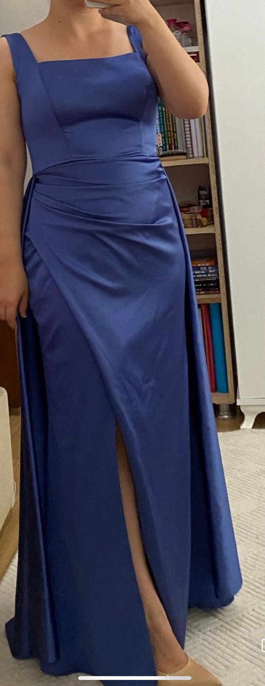 Askılı, straplez lacivert abiye elbise, drapeli detaylar ve ince kesimiyle modern klasik tarz sunar. Düğünler için uygun.