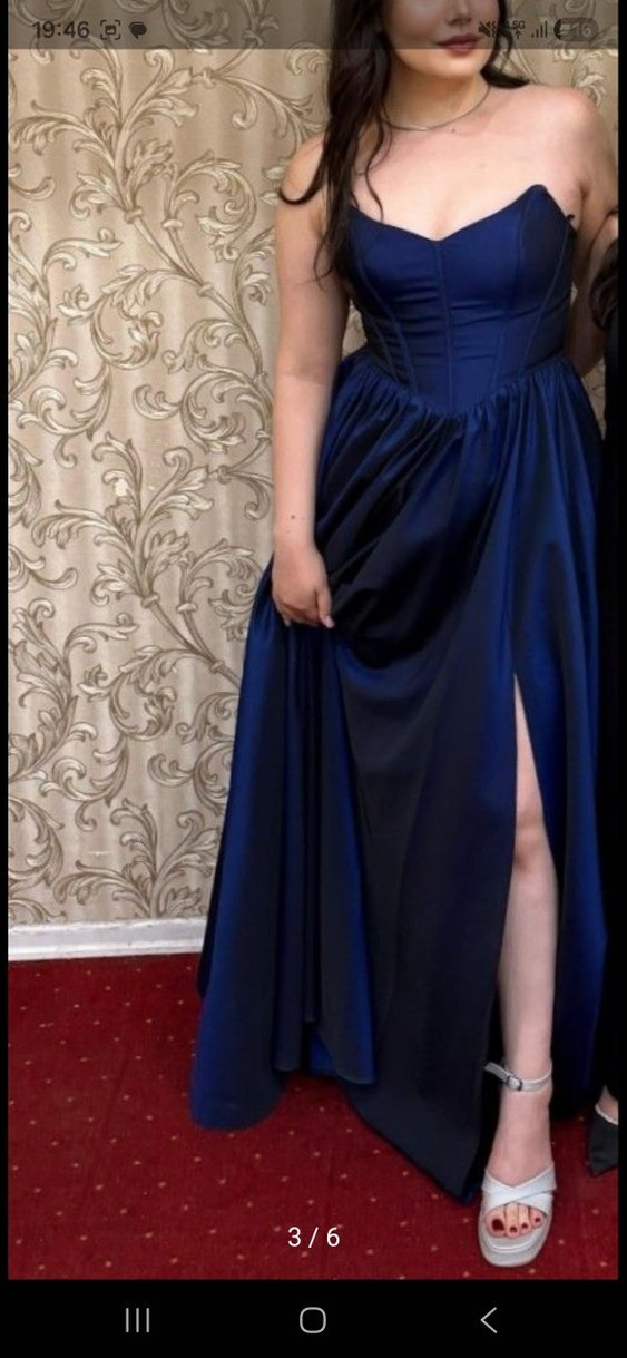 Lacivert, drapeli ve parlak kumaştan uzun abiye elbise. Straplez, ince askılı ve vücuda oturan kesimiyle modern klasik bir şıklık sunar. ✨ 1 kez giyildi