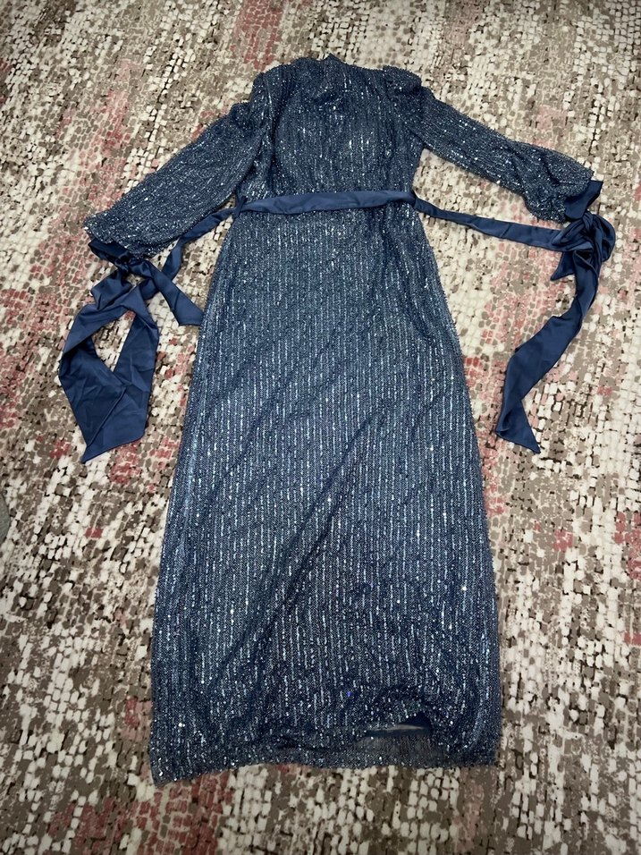 Drapeli detaylara ve tekne yaka sahip, lacivert renkte, uzun, bohem tarzda abiye elbise. Parti için uygun, şık ve göz alıcı. ✨