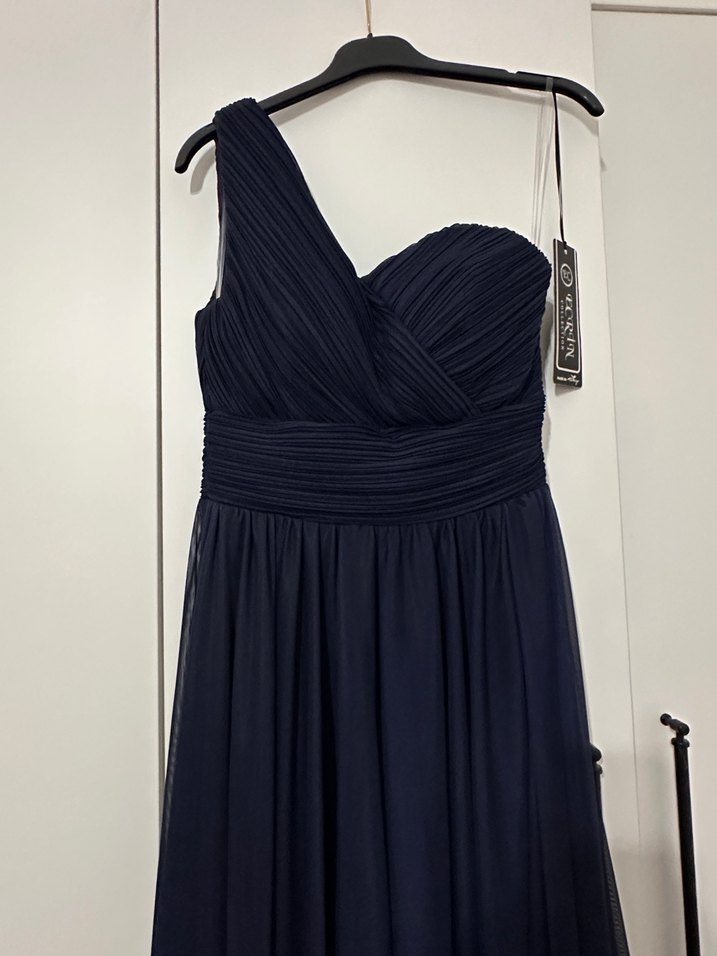 1 kere kısa süre için giyildi, kuru temizleme yapıldı. Lacivert uzun abiye elbise, drapeli ve askılı straplez yakaya sahip, klasik ve şık.