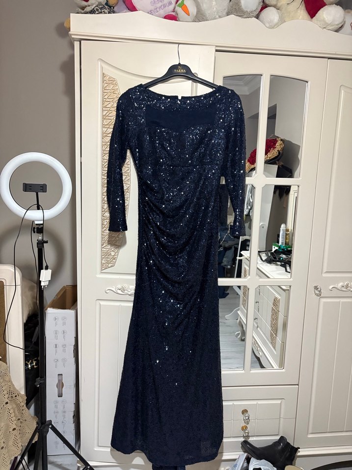 Lacivert uzun abiye elbise, drapeli detaylı ve balıkçı yaka tasarıma sahip. Uzun kollu ve desenli dokusu ile düğünler için uygun. ✨