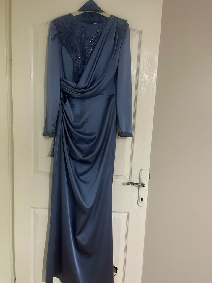 Lacivert uzun abiye elbise, drapeli ve V yakalıdır. Uzun kollu, modern klasik tarzda, düğün için uygundur. Kumaşı pürüzsüz ve şıktır.