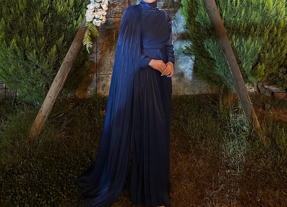 *1 kez giydim. Lacivert uzun abiye elbise, drapeli tasarımı, uzun kollu ve kayık yaka ile modern klasik, mütevazı ve minimalist bir şıklık sunar. Düğünler için uygundur.