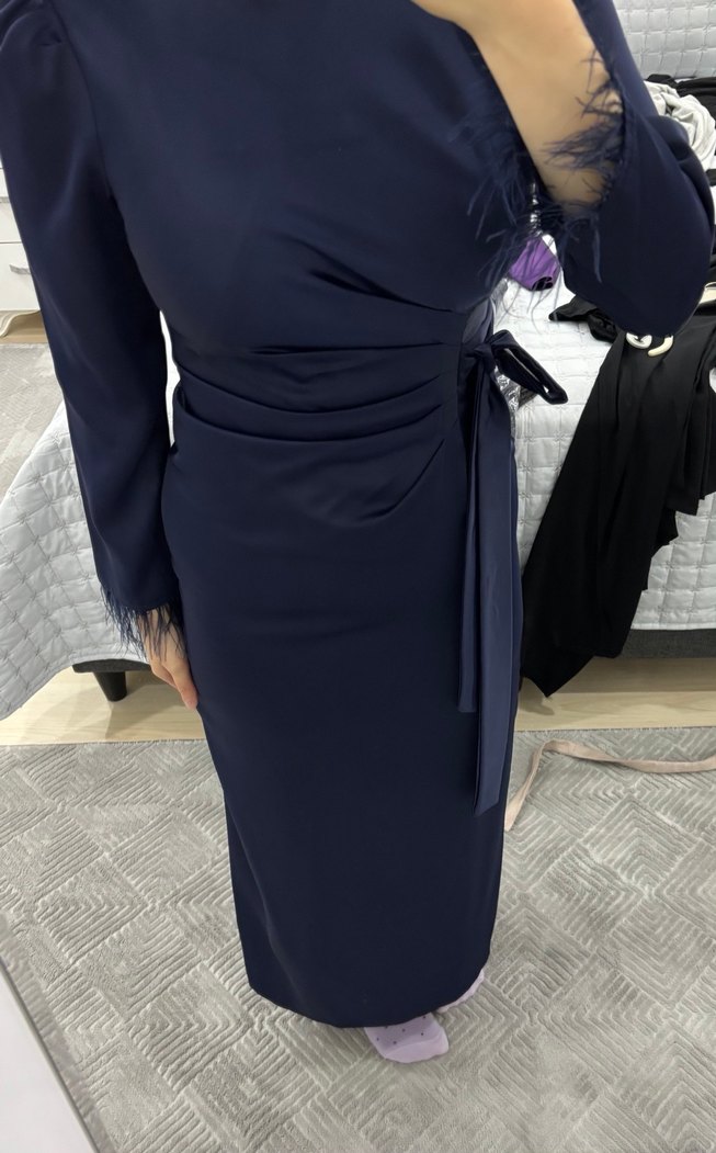 Lacivert abiye elbise, drapeli ve vücuda oturan kesimiyle dikkat çekiyor. Notlu yaka, ince askılar ve tüy detayları bulunur. Şık ve ofis için uygun.