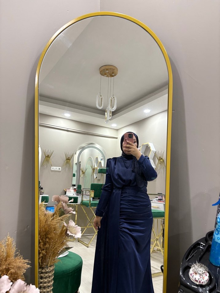 Lacivert uzun abiye elbise, yüksek yakalı, uzun kollu ve drapeli tasarıma sahiptir. Düzenli kesimi ve mütevazı, çağdaş stiliyle düğünlere uygundur.