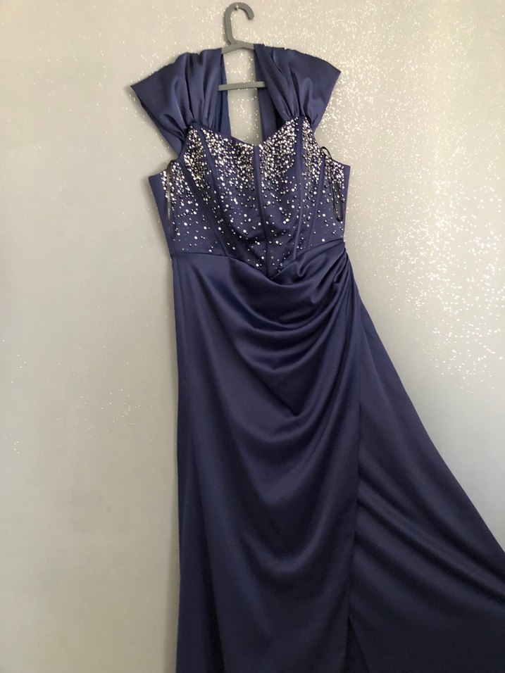Lacivert, straplez yakalı, drapeli ve parlak işlemeli, uzun ve kolsuz, klasik-modern kesimde abiye elbise. Düğün için uygun.