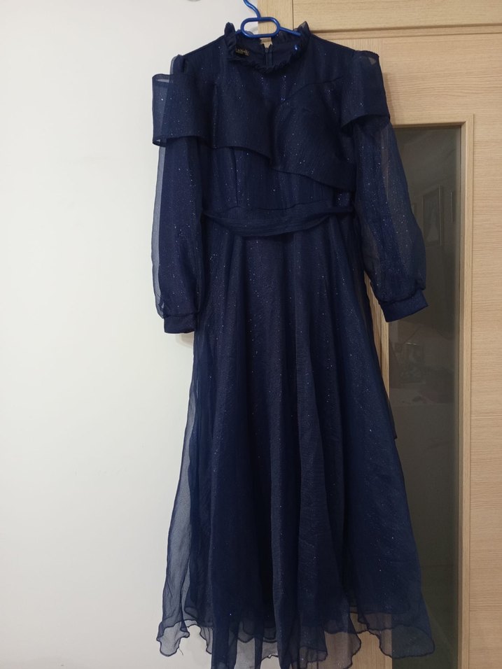 Lacivert renkli, uzun kollu ve drapeli tasarıma sahip ışıltılı uzun elbise. Yüksek yakalı ve akışkan yapısıyla düğünler için uygun, vintage ve modern klasik tarzda.