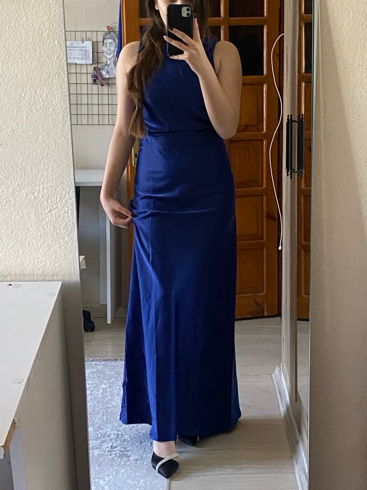 Lacivert uzun abiye elbise, drapeli ve vücuda oturan kesimiyle, kolsuz ve V yakalıdır. Romantik akşamlar için uygundur. elbisede fermuar var ve daraltıldı terzi de dar gelirse açtırabilirsiniz