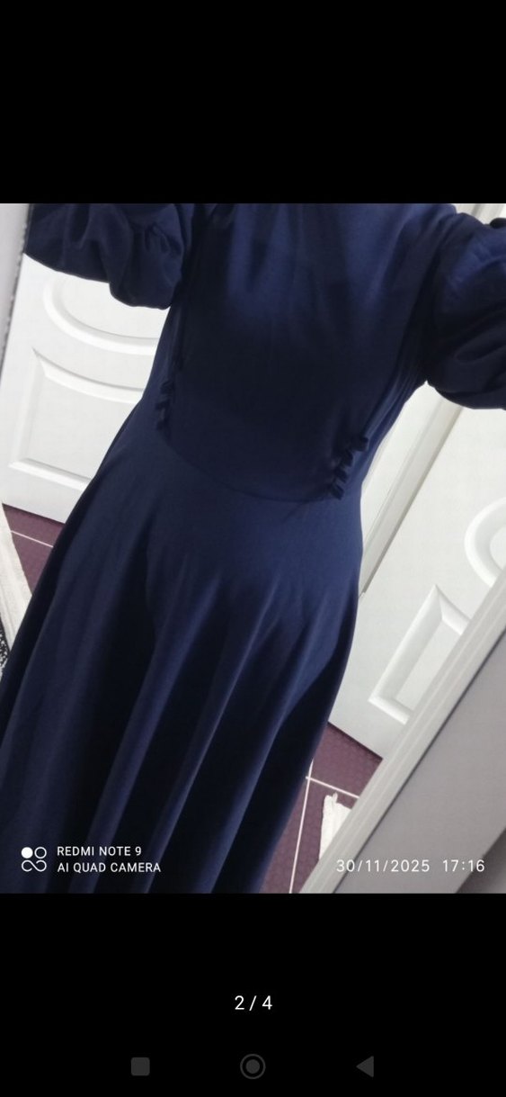 Lacivert uzun elbise, drapeli ve V yaka tasarımıyla fit kesimdedir. Askılı kollu ve yumuşak sentetik kumaştan, düğün nişan kına elbisesimodest tarzda.