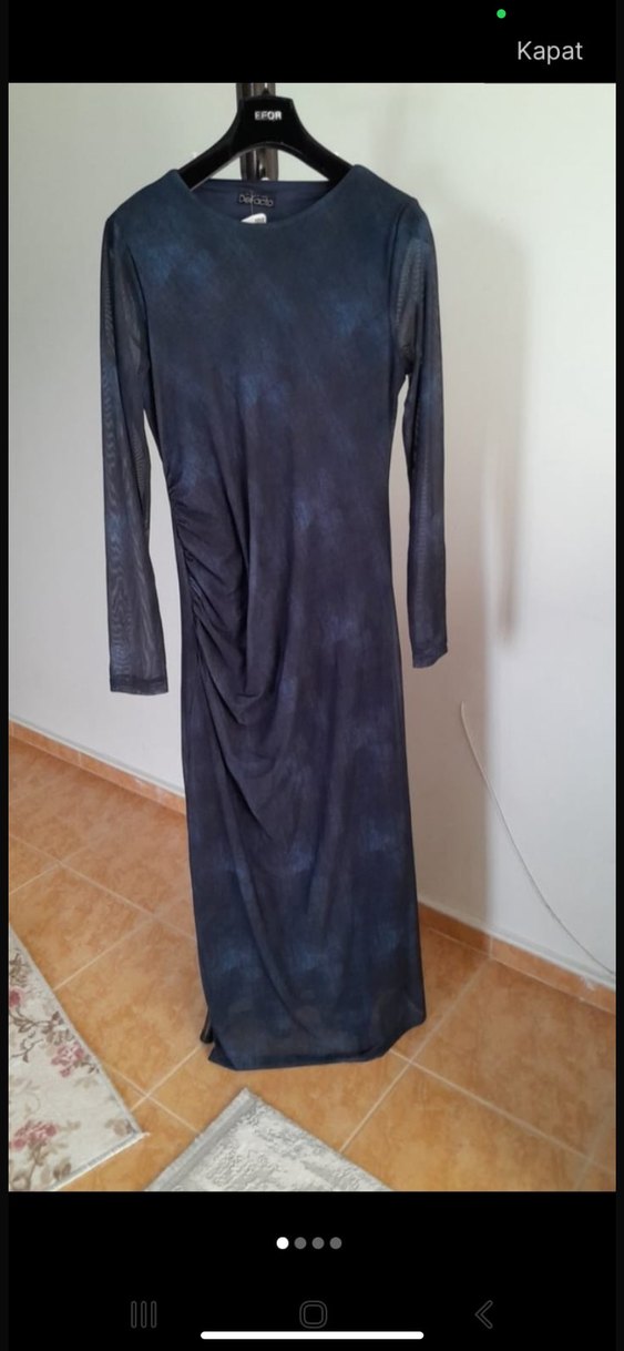 Lacivert tonlarda, yüksek yakalı ve uzun kollu, drapeli tasarıma sahip dar kesim uzun elbise. Sentetik kumaştan üretilmiş, gotik stil için uygun.
