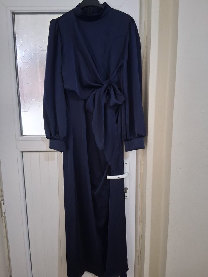 Lacivert uzun elbise, yüksek yakalı ve belde fiyonk detaylı drapeli tasarıma sahiptir. Askılı kollu ve regular fit, pürüzsüz sentetik kumaştan, ofis için uygundur.