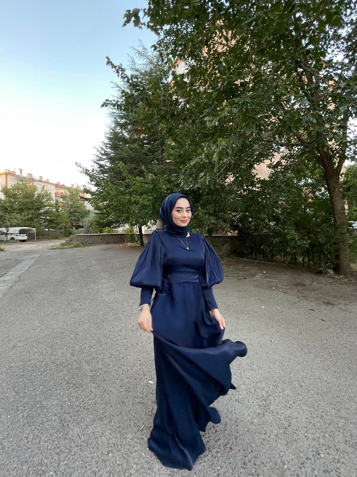 Lacivert, yüksek yakalı, uzun kollu, drapeli ve bol kesimli uzun elbise. İpek gibi kumaştan, günlük sokak stiline uygun.