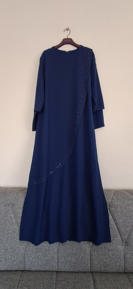 Lacivert uzunca, bol kesim, uzun kollu, yakası kesik yakalı elbise. Drapeli tasarım ve sade süslemelerle minimalist tarzda. Sentetik kumaştan üretilmiştir. uzunluk:140 cm bel: 54 cm kol uzunluk: 54 cm