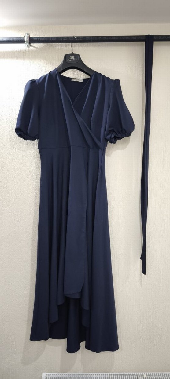 Lacivert uzun elbise, drapeli tasarım, V yakalı ve bol kesimdir. Kolları lastiklidir ve yumuşak sentetik kumaştan üretilmiştir, ofis için uygundur.