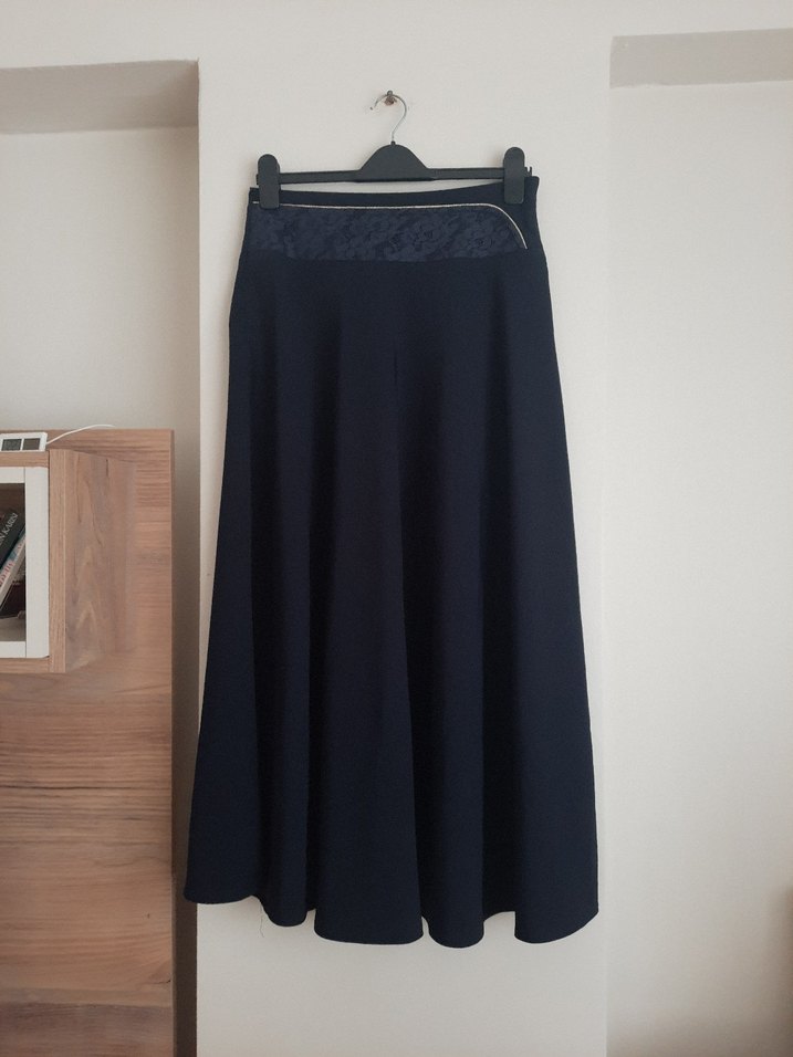 Lacivert uzun etek, drapeli tasarıma ve bol kesime sahiptir. Sade ve şık görünümüyle ofis ortamına uygundur. Boyu 98 cm beli 40 cm 1 kere kullanıldı