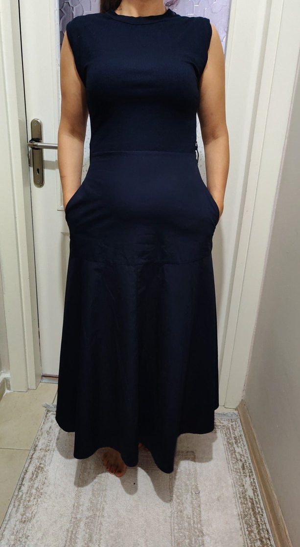 Lacivert renkte, sentetik kumaştan üretilmiş, drapeli ve regular fit uzun kadın eteği. Ofis için minimal ve normcore tarzda.