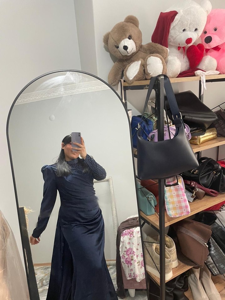 Dar kesim lacivert abiye elbise, yüksek yakalı ve uzun kollu. Şık drapeli detaylarıyla gotik tarz ve resmi düğünler için uygun.
