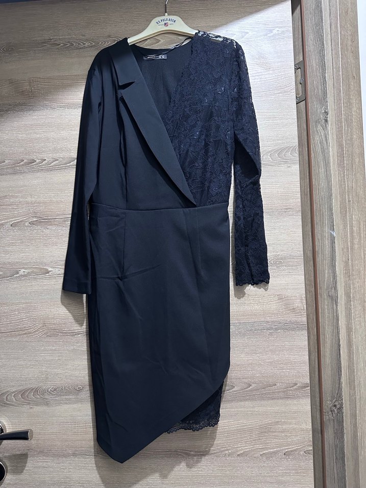 Siyah uzun kollu ofis , yaka kısmında kesik detay ve tek taraflı dantel drapeli tasarımıyla modern klasik bir görünüm sunar.Hiç giyilmedi.