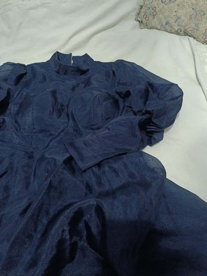 Lacivert renkte, yüksek yakalı ve uzun kollu, drapeli detaylara sahip, vücuda oturan uzun boy kadın elbisesi. Avant-garde ve şık bir düğün tercihi.