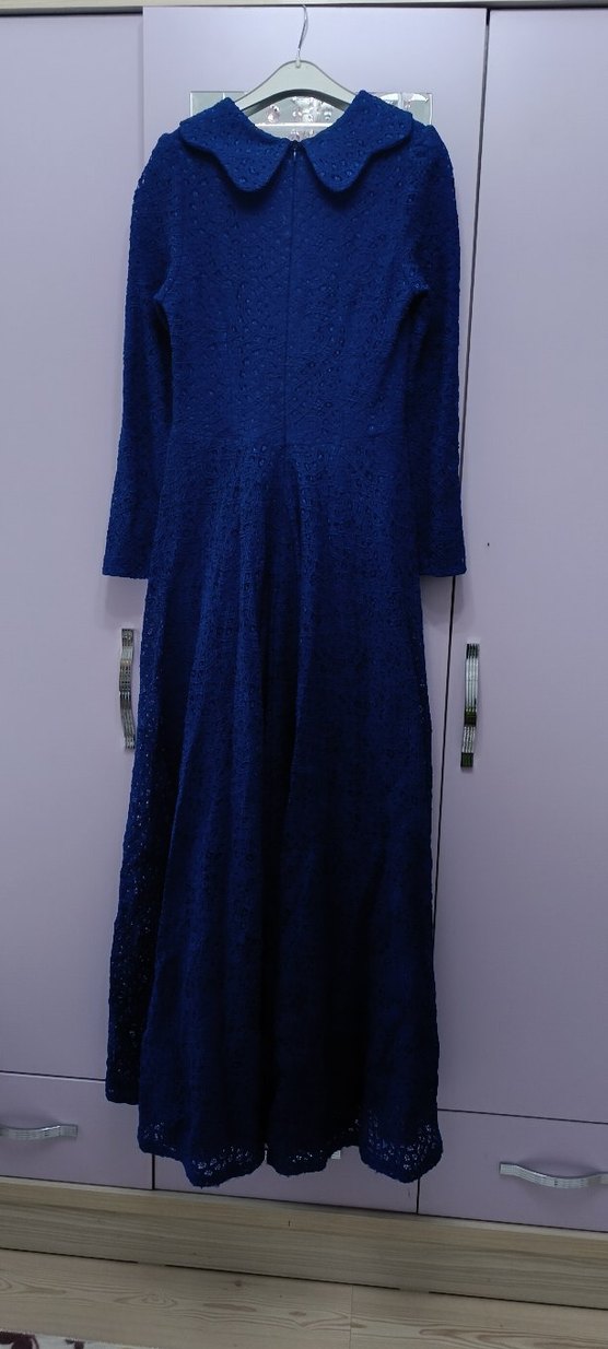 Lacivert, uzun kollu, drapeli ve yakası kesimli bu dar kesim uzun elbise, gotik tarzda düğünler için uygundur. saks mavisi dantel elbise 38 beden 1 kere düğünde giyildi temiz bir sorunu yoktur