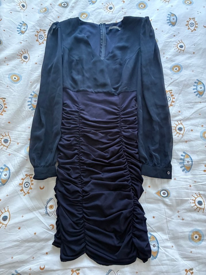 Lacivert Drapeli Uzun Kollu V Yakalı Elbise