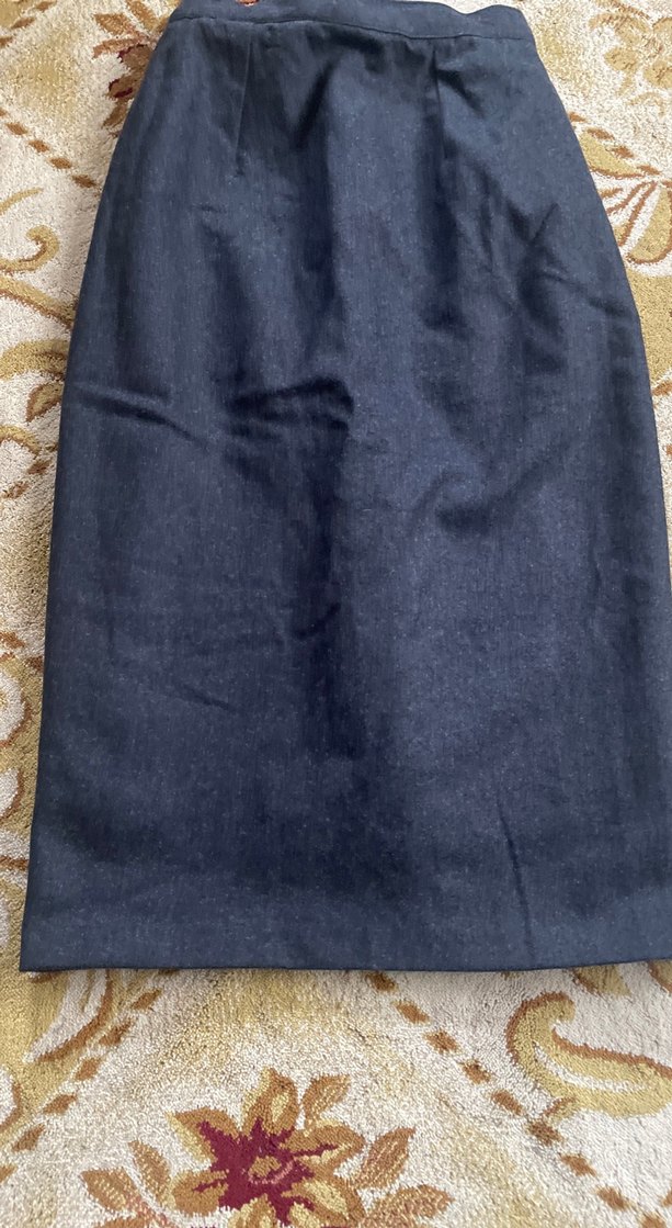 Lacivert yünkumaştan, drapeli ve uzun kesim kalem etek. Düz ve desen içermeyen, ofis için uygun minimalist bir tasarıma sahiptir.