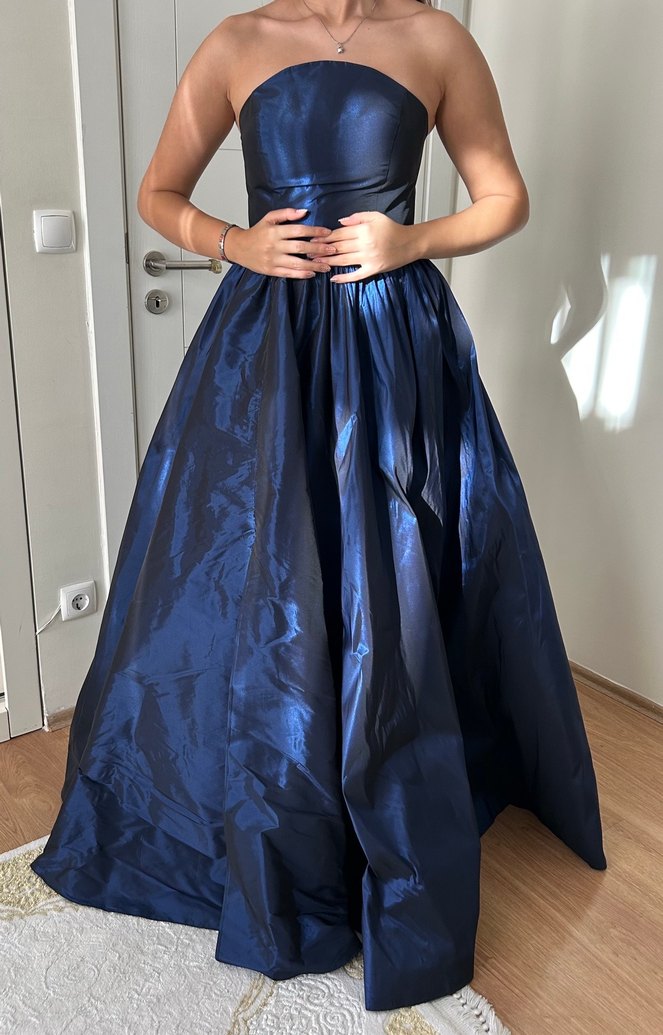 Lacivert renkli, straplez ve drapeli uzun abiye elbise bel kısmında yırtılma var terzide diktirilmesi gerekiyo