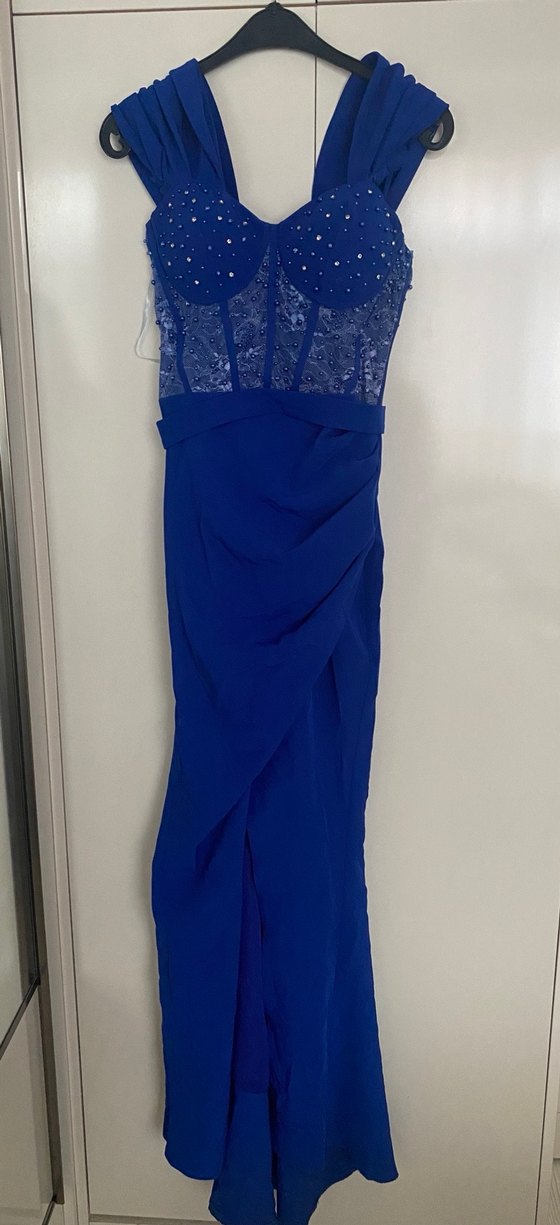 Lacivert uzun abiye elbise, straplez ve kolsuz. Transparan işlemeli üst kısmı ve drapeli etek detayı ile şık bir tasarım sunar. Madonna yaka istendiğinde yaka kısımlarını askı gibi yukarı kaldırabilirsiniz. İade yoktur.