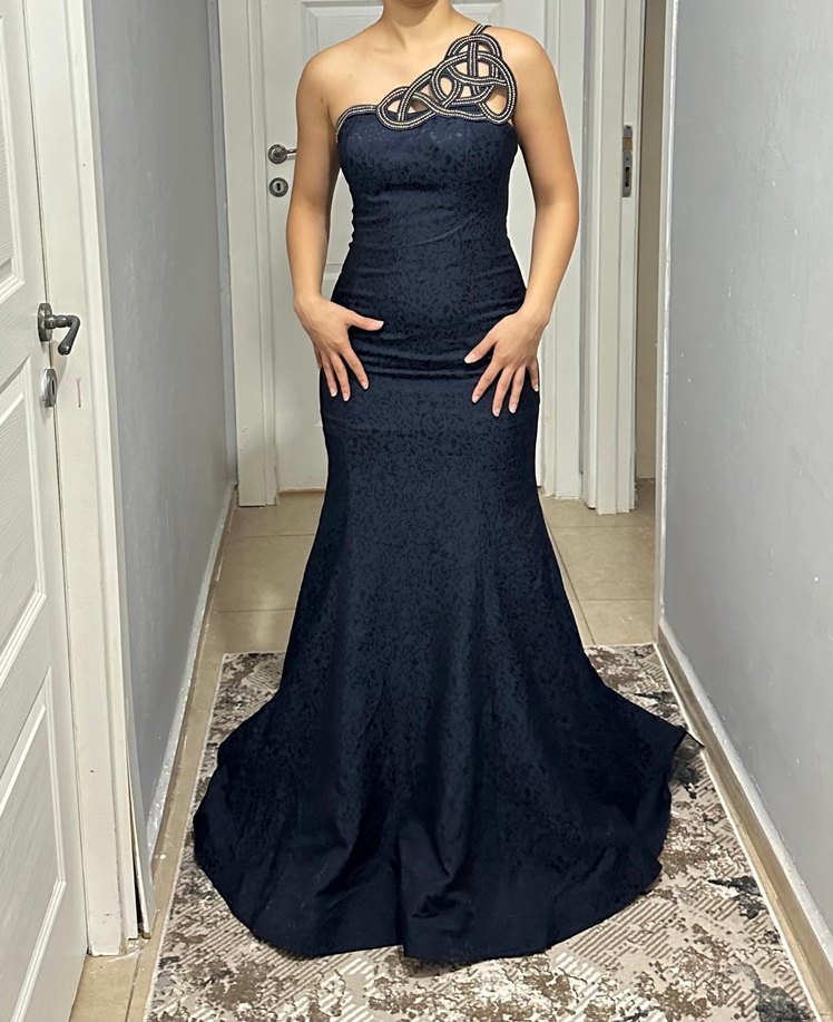 Lacivert Drapeli Uzun Straplez Abiye Elbise