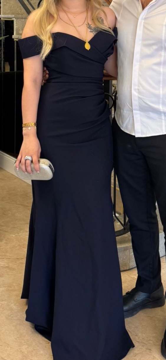 Siyah, straplez yaka ve drapeli detaylara sahip, klasik modern tarzda, uzun ve vücuda oturan kadın elbisesi. İki kere giyildi hiç deformesi yok. Podium vipten alındı.