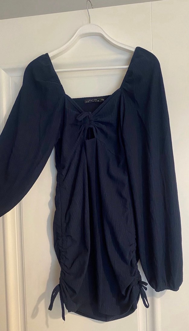 Lacivert renkte, yumuşak keten kumaştan, drapeli ve V yakalı, uzun kollu, midi boyda, dar kesim elbise. Romantik akşamlar için uygun, desen içermeyen şık tasarım.