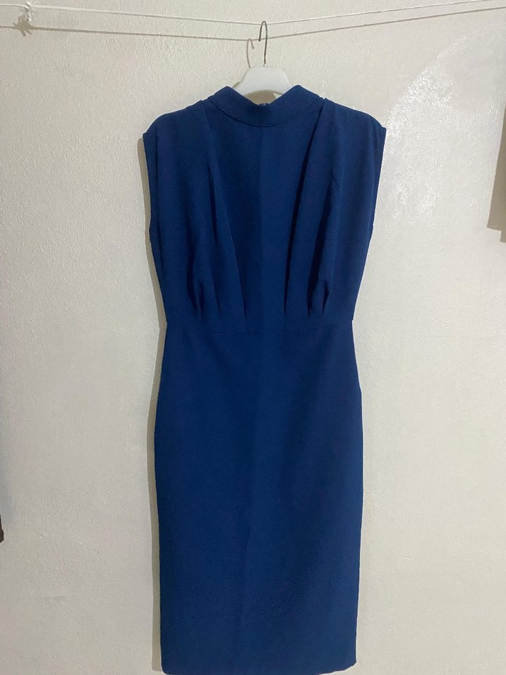 Lacivert, yüksek yakalı, kolsuz ve drapeli uzun elbise. Minimalist ve modern klasik tarzda, ofis için uygun.
