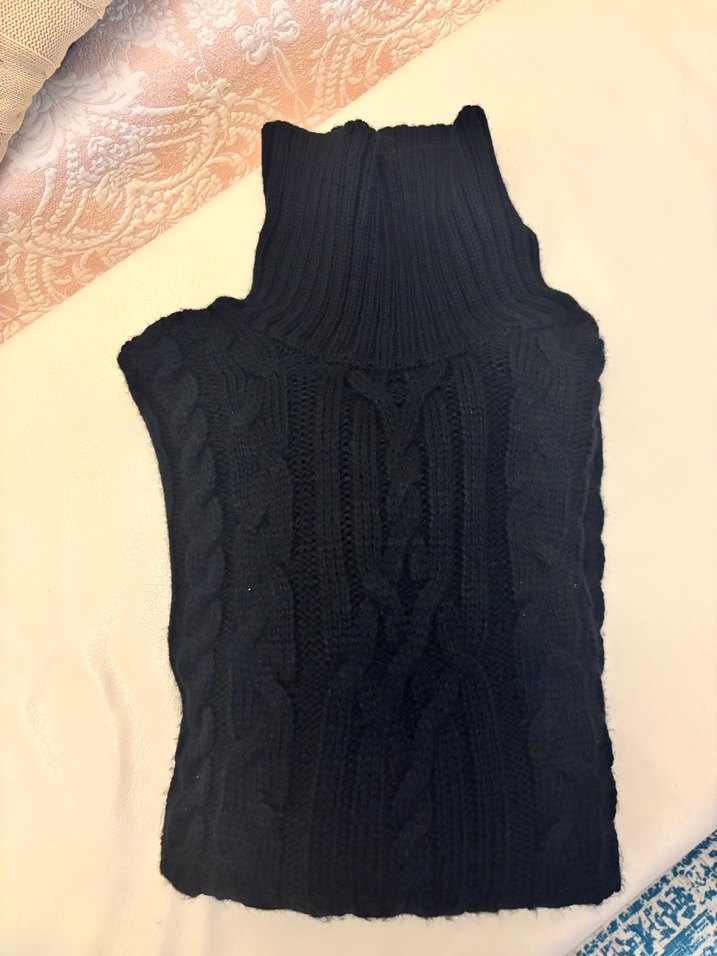 Bu lacivert kolsuz kazak, örgü dokusu ve boğazlı yakasıyla rahat ve şık bir günlük kullanıma uygundur.