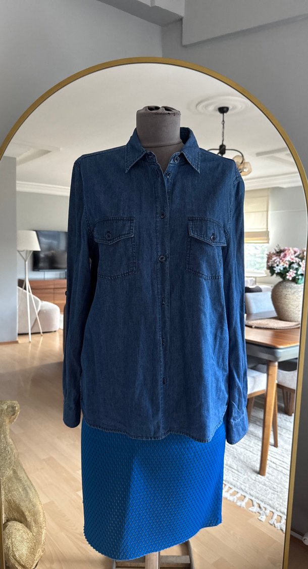 Lacivert denim gömlek, yakalı, uzun kollu ve bol kesimdir. Düğmeli cepleri ve normal midi boyu ile gündelik kullanıma uygundur.