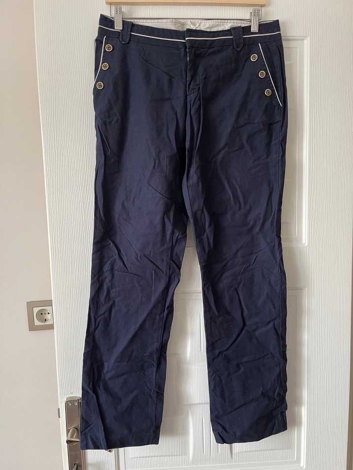 lacivert denim pantolon, normal boy ve düğmeli detaylara sahip. Rahat kesimiyle günlük sokak stili için uygundur.