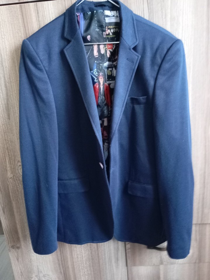 Düğmeli, notched lapel detaylı lacivert erkek blazer ceket. Uzun kollu ve baskılı astarlı, ofis stiline uygun.