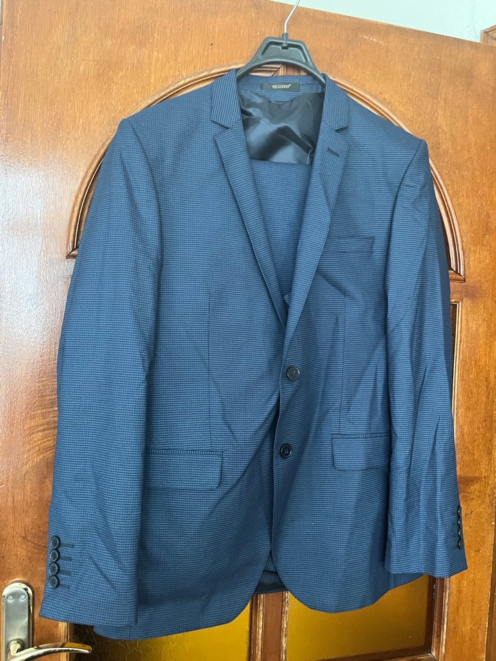 Lacivert renkte, düğmeli erkek ceket küçük kareli desenleri yelek pantolon ve ceket takımdır ayrı ayrı satılmaz