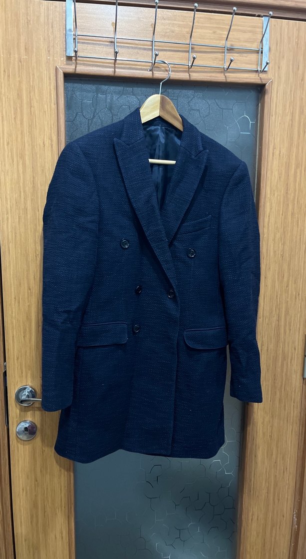 Lacivert keten kumaştan, notched lapel yakalı, düğmeli erkek kaban. Normal boy ve regular fit, uzun kollu, iş ortamı için uygun.
