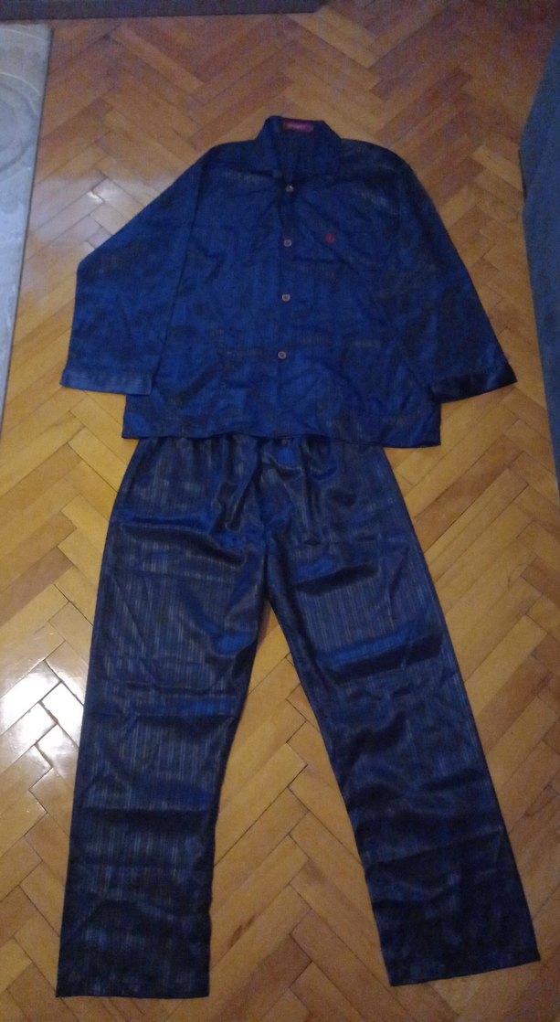 Lacivert renkte, düğmeli ve geniş kesim erkek pijama takımı. Uzun kollu ve klasik yakalı, rahat kullanıma uygundur.
