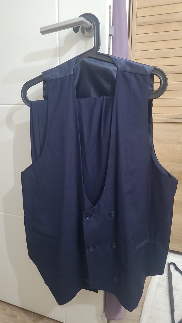 Düğmeli önü ve kesik yakası olan, lacivert renkte, sentetik kumaştan yapılmış erkek yelek. İş ve ofis için uygundur.
