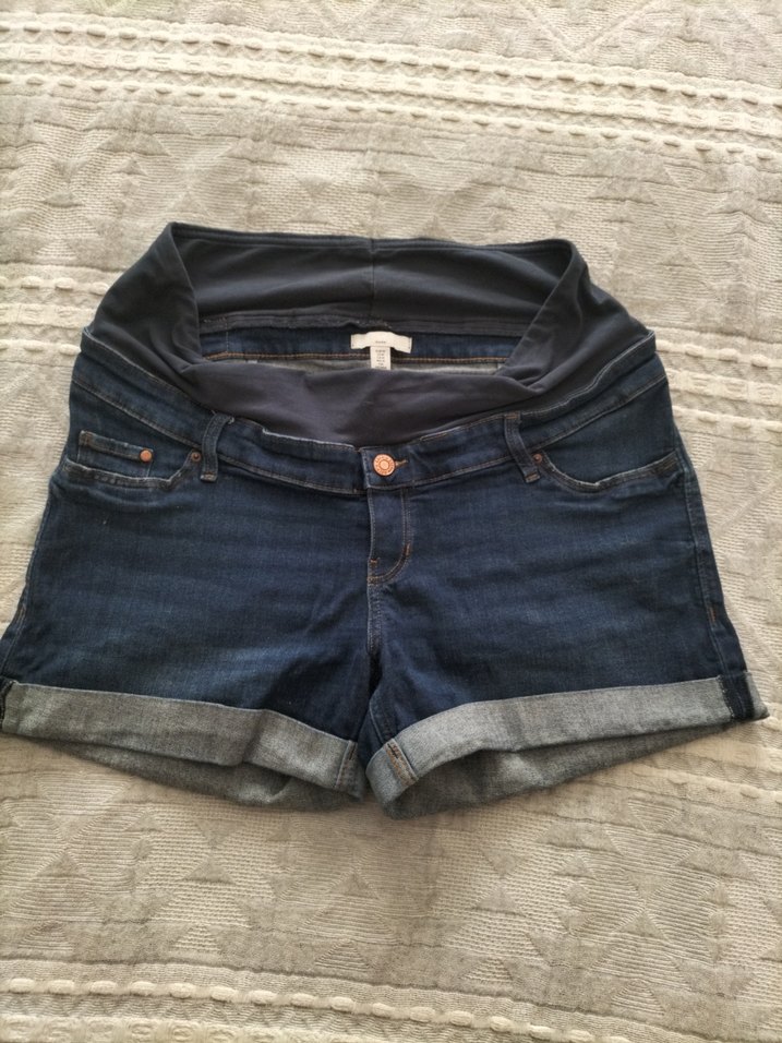 Lacivert denim hamile şort, düğmeli ve bol kesimdir. Kısa boyda, günlük rahat sokak stili için uygundur.
