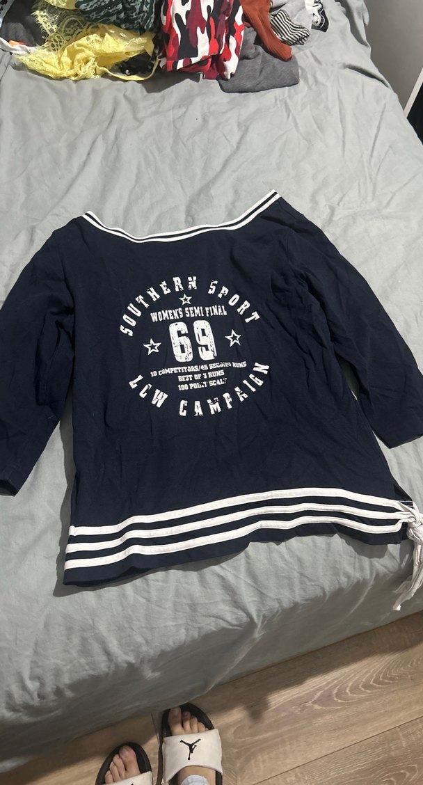 Lacivert, bol kesim, uzun kollu hamile tişörtü, tekne yaka ve baskılı detaylara sahip. Düğmeli tasarımıyla günlük kullanıma uygun.