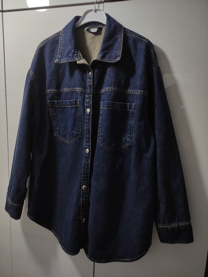 Lacivert renkli, düğmeli ve uzun kollu kadın denim ceket. Salaş kesimi ve notlu yakasıyla günlük rahat sokak stiline uygundur. defosu sorunu yoktur