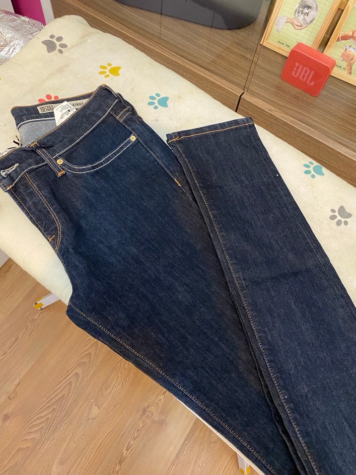 Lacivert düğmeli denim pantolon, regular fit ve normal boyda. Günlük kullanıma uygun, trendi ve sade stilde rahat bir seçenek.