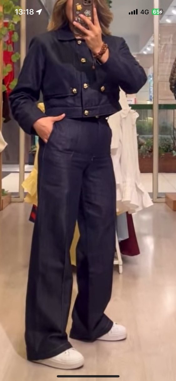 Zara model lacivert denim kumaştan, düğmeli, midi boy, regular fit kesime sahip kadın pantolon ve jean ceket giy çık takımı Ofis ve gündelik kullanıma uygun şık tasarım
