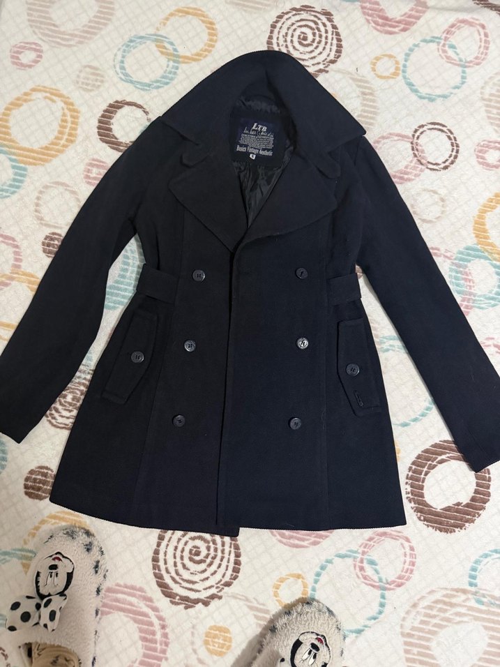 Lacivert renkli kadın kaban, çift düğmeli önü, yan cepleri ve geniş yakası ile şık bir tasarıma sahiptir. Bel kısmında kemer bulunur, sıcak tutan yumuşak kumaştan yapılmıştır.
