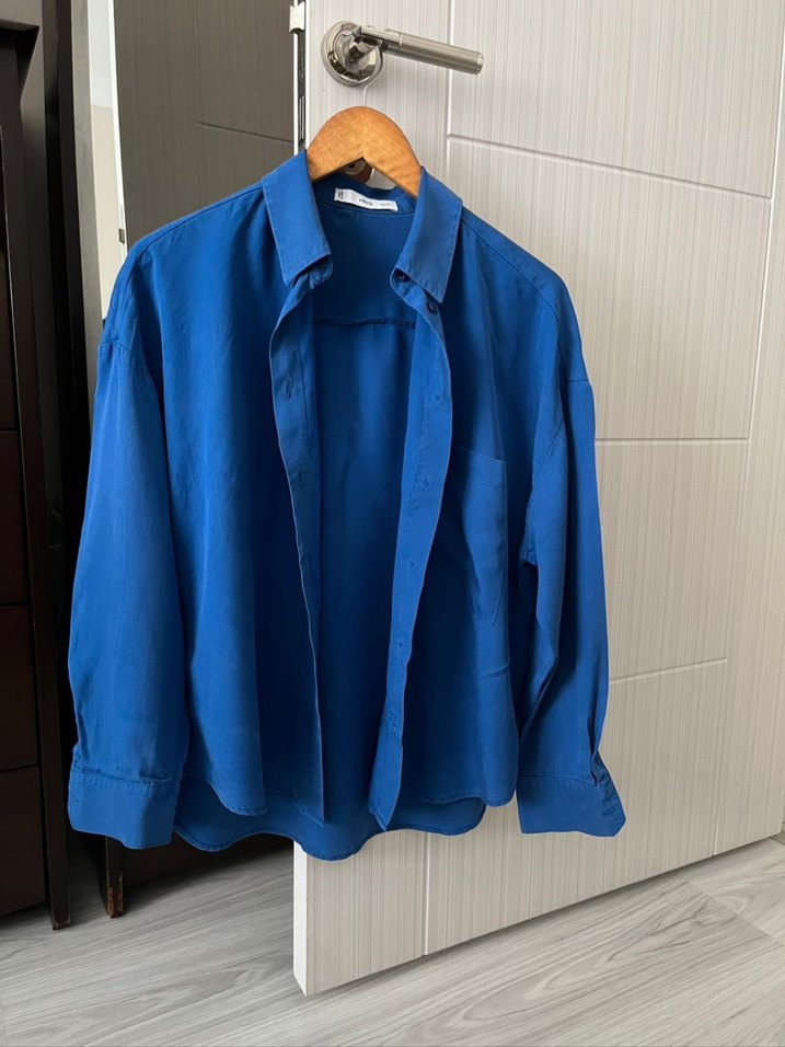 Bol kesim, uzun kollu, düğmeli lacivert keten gömlek, minimal ve günlük sokak stili için uygun.