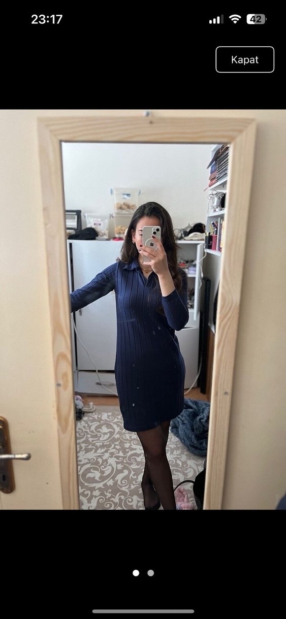 Lacivert, düğmeli, yaka detaylı ve uzun kollu, denim kumaştan yapılmış kadın triko elbise. Günlük kullanım ve iş ortamına uygun şık bir model.